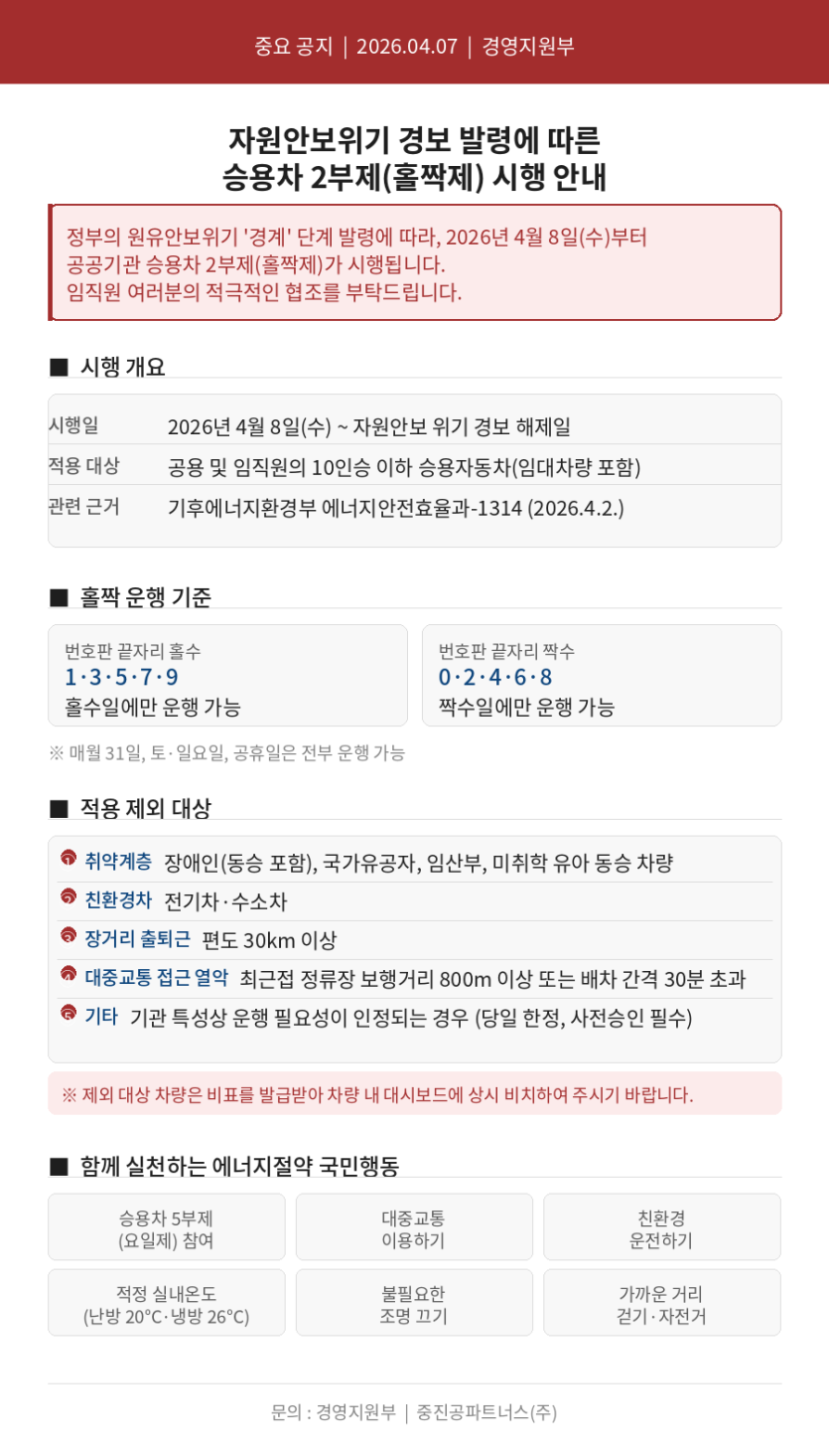 승용차 2부제(홀짝) 준수 및 에너지절약 실천 요청 페이지 정보 최고관리자 2026-04-07 18 회 0 건 본문 자원안보위기 경보 발령에 따른 승용차 2부제(홀짝제) 시행 안내 다음글2026년 신년사 목록 댓글 0 댓글목록 등록된 댓글이 없습니다.